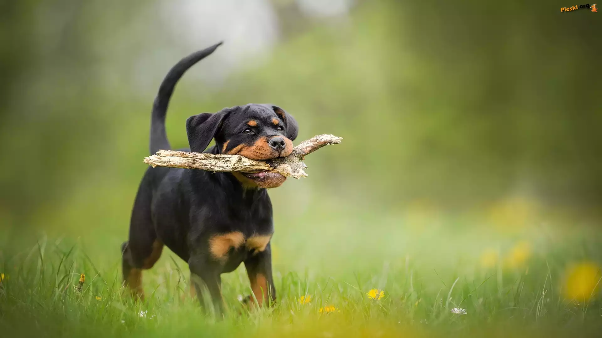 Łąka, Pies, Trawa, Rottweiler, Szczeniak, Patyk, Kwiatki, Pieski