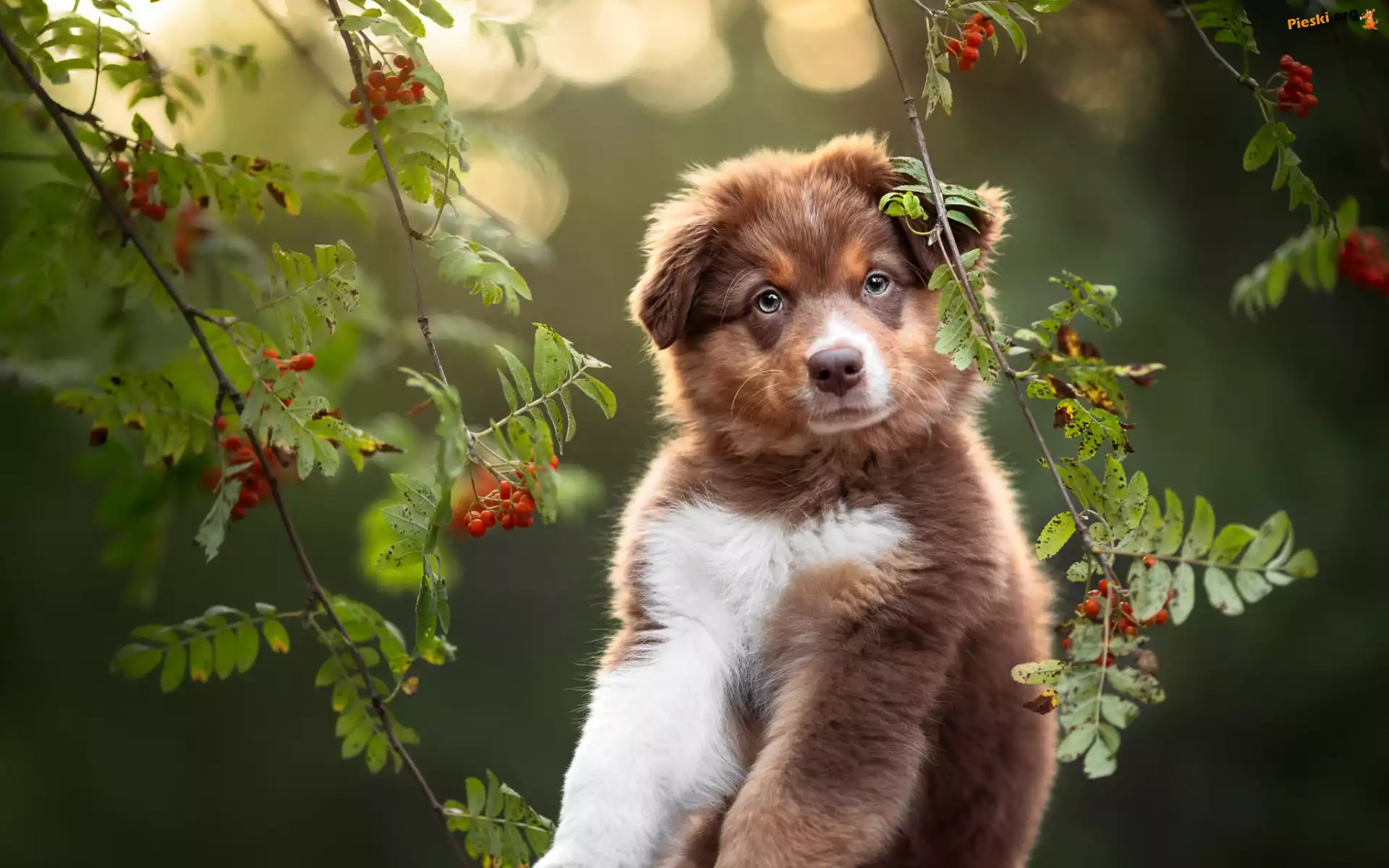 Listki, Szczeniak, Owczarek australijski, Pies, Jarzębina, Gałązki, Pieski
