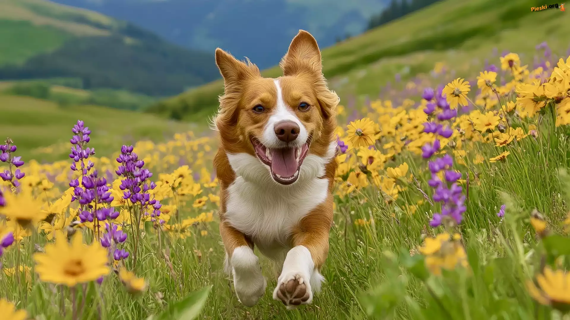 Kwiaty, Łąka, Pies, Biegnący, Pieski