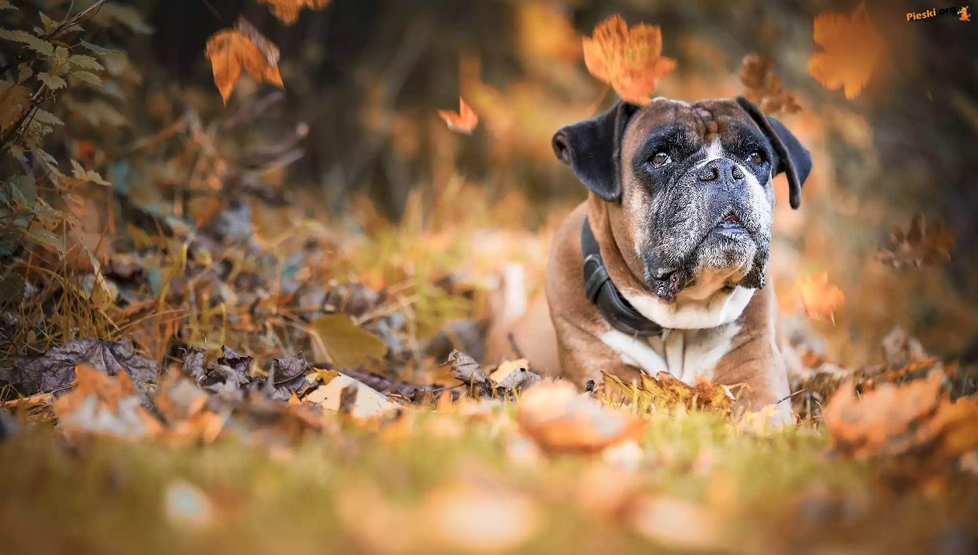 Bokser, Leżący, Pies, Liście