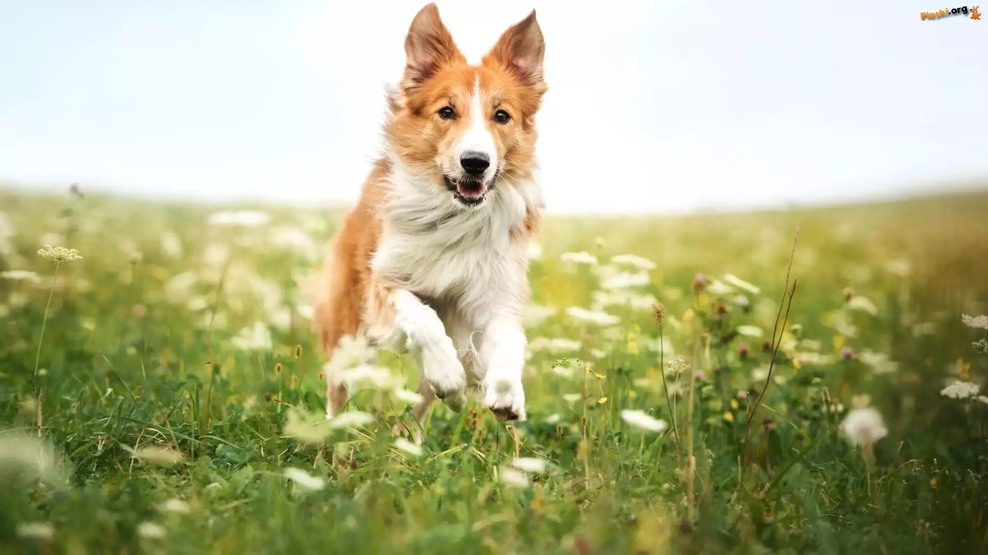 Rozmyte, ka, Border collie, Kwiaty, To Leonberger, Chopiec, Pies, Plaa ka, Pies, Border collie, Trawy