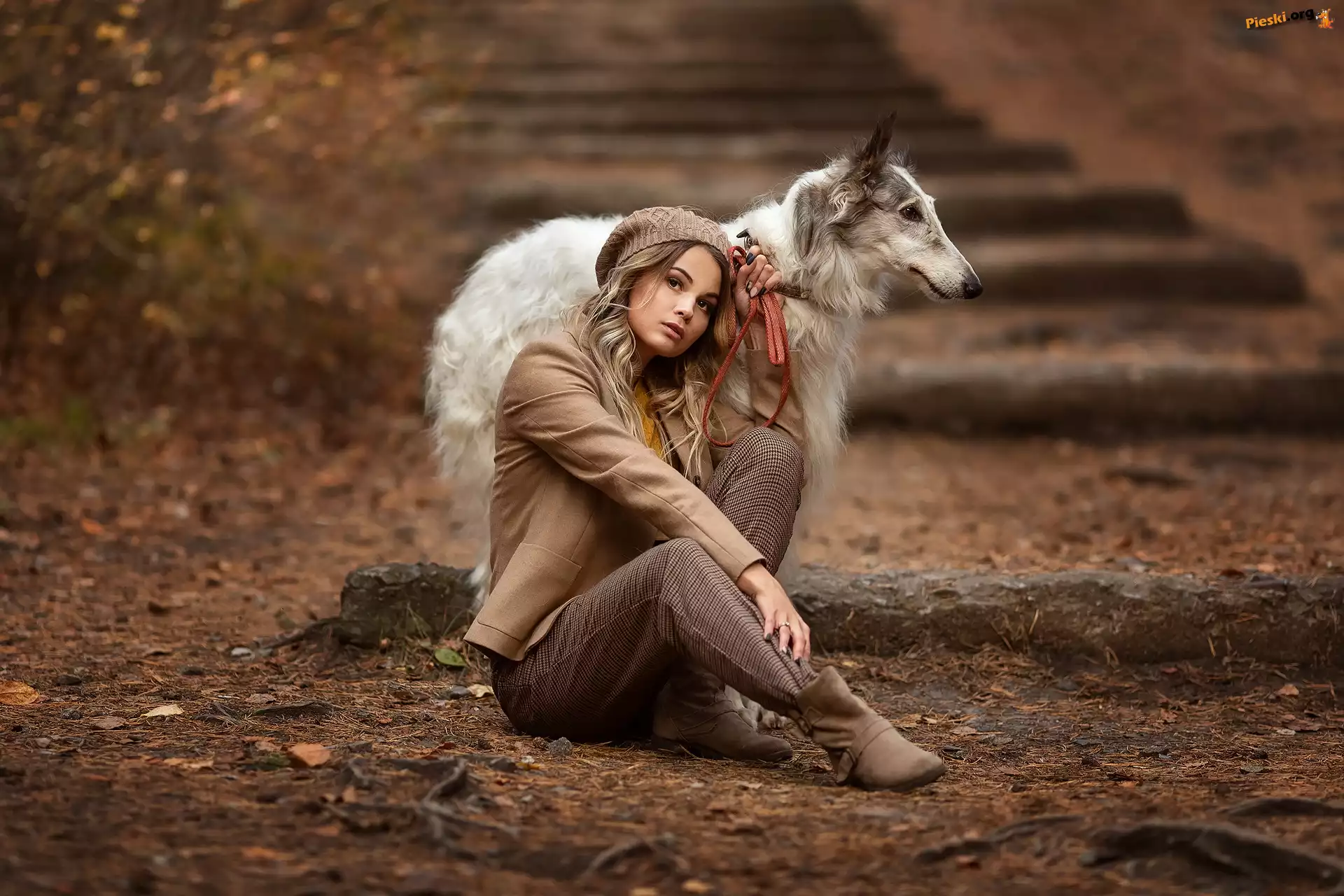 Pies, Chart rosyjski, Borzoj Charty, Rosyjskie Borzoj, Kobieta, Pies, Chart rosyjski Psy, Blondynka, Kobieta, Dwa, Charty rosyjskie borzoj Rosyjski, Pies, Chart, Borzoj