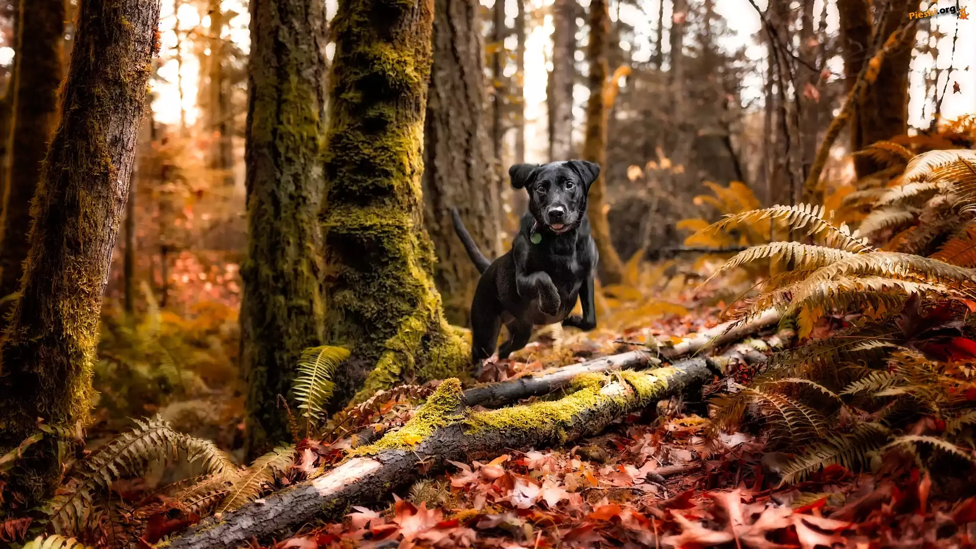 Czarny, Paprocie, Drzewa, Pies, Las, Rośliny, Pieski