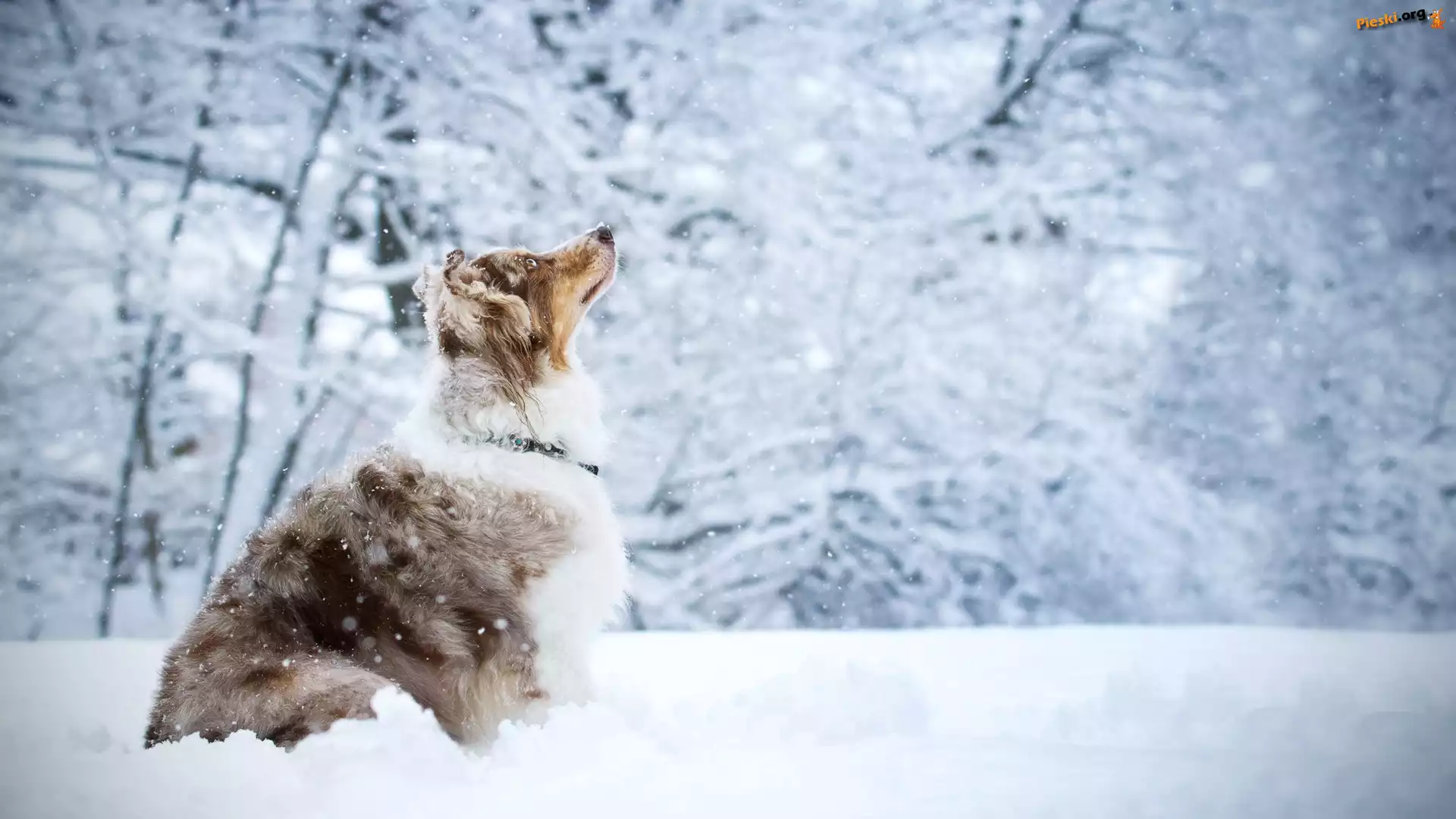 Drzewa, Pies, Owczarek australijski, Śnieg