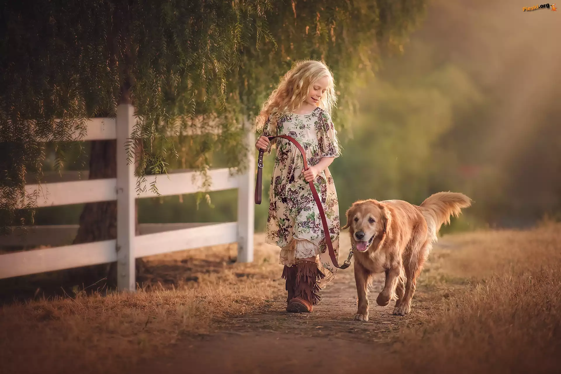 Pies, Drzewo, Golden retriever, Ścieżka, Płot, Dziewczynka, Spacer, Pieski