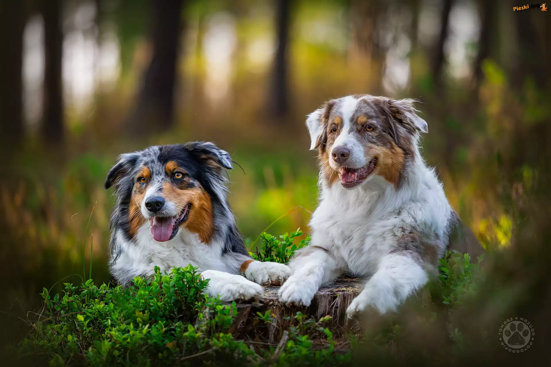 Owczarki australijskie, Rośliny, Dwa, Pniak, Psy, Pieski