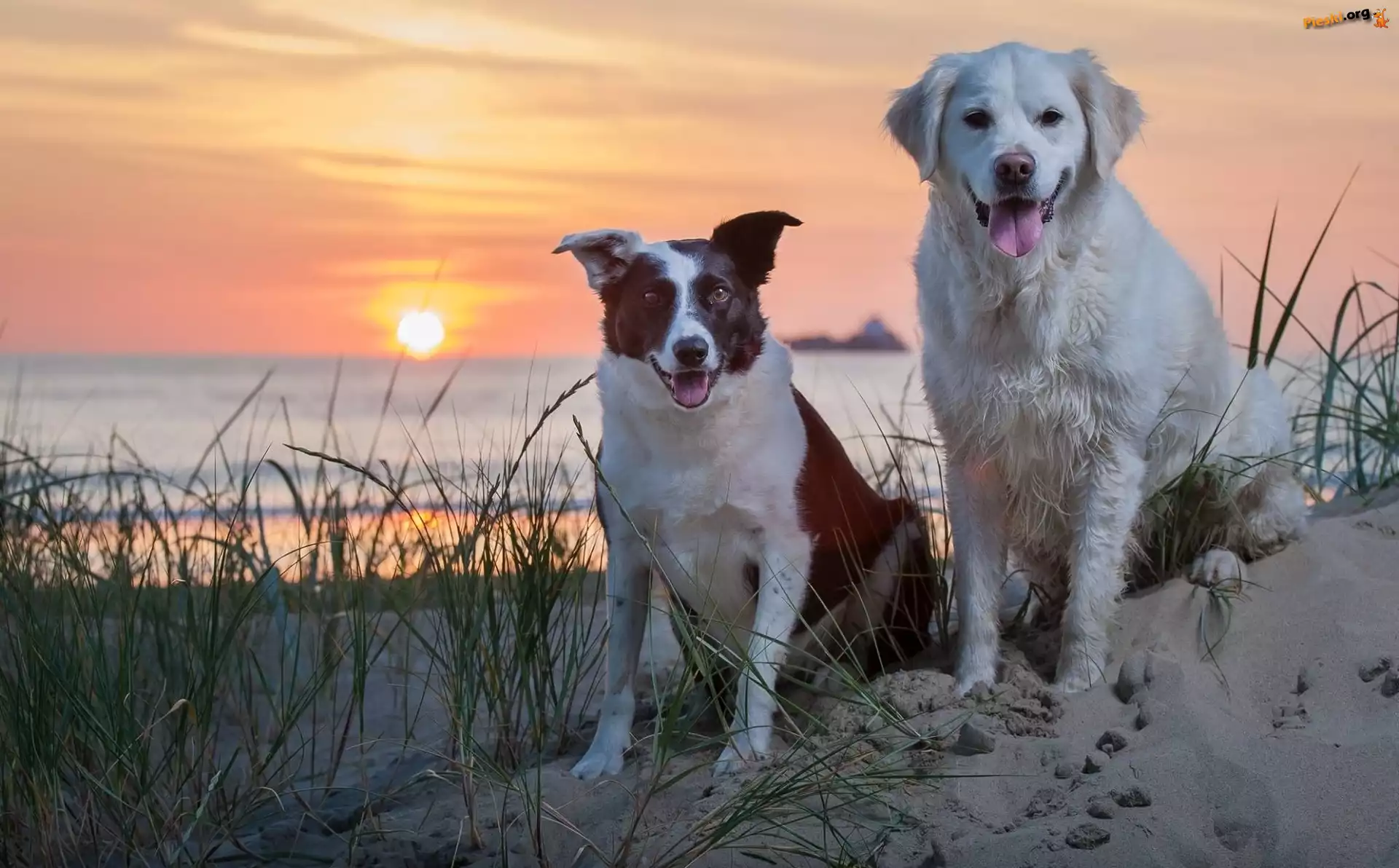 Dwa, Zachód, Morze, Słońca, Psy, Pieski