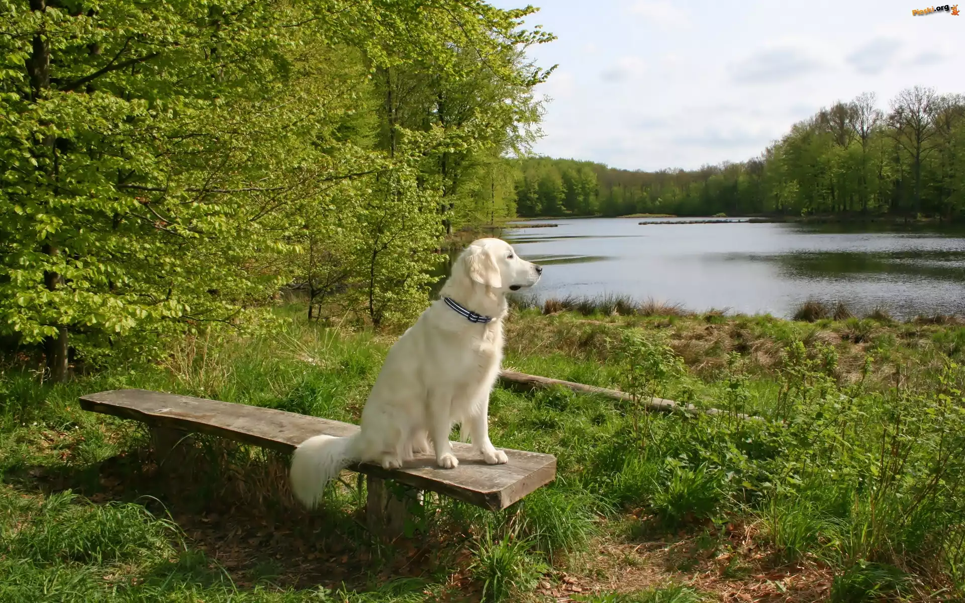 Jezioro, Piesek, Biały, Ławka, Las, Pieski