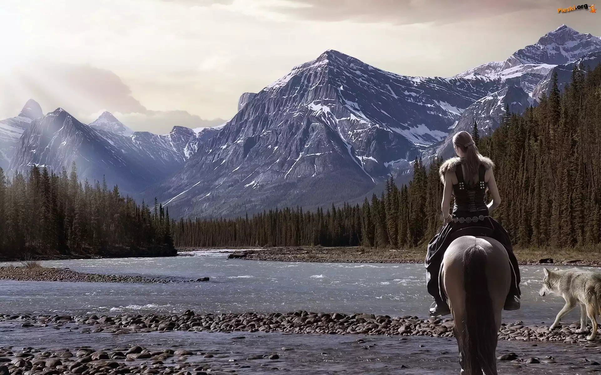 Kobieta, Góry, Rzeka, Koń, Pies, Lasy, Pieski