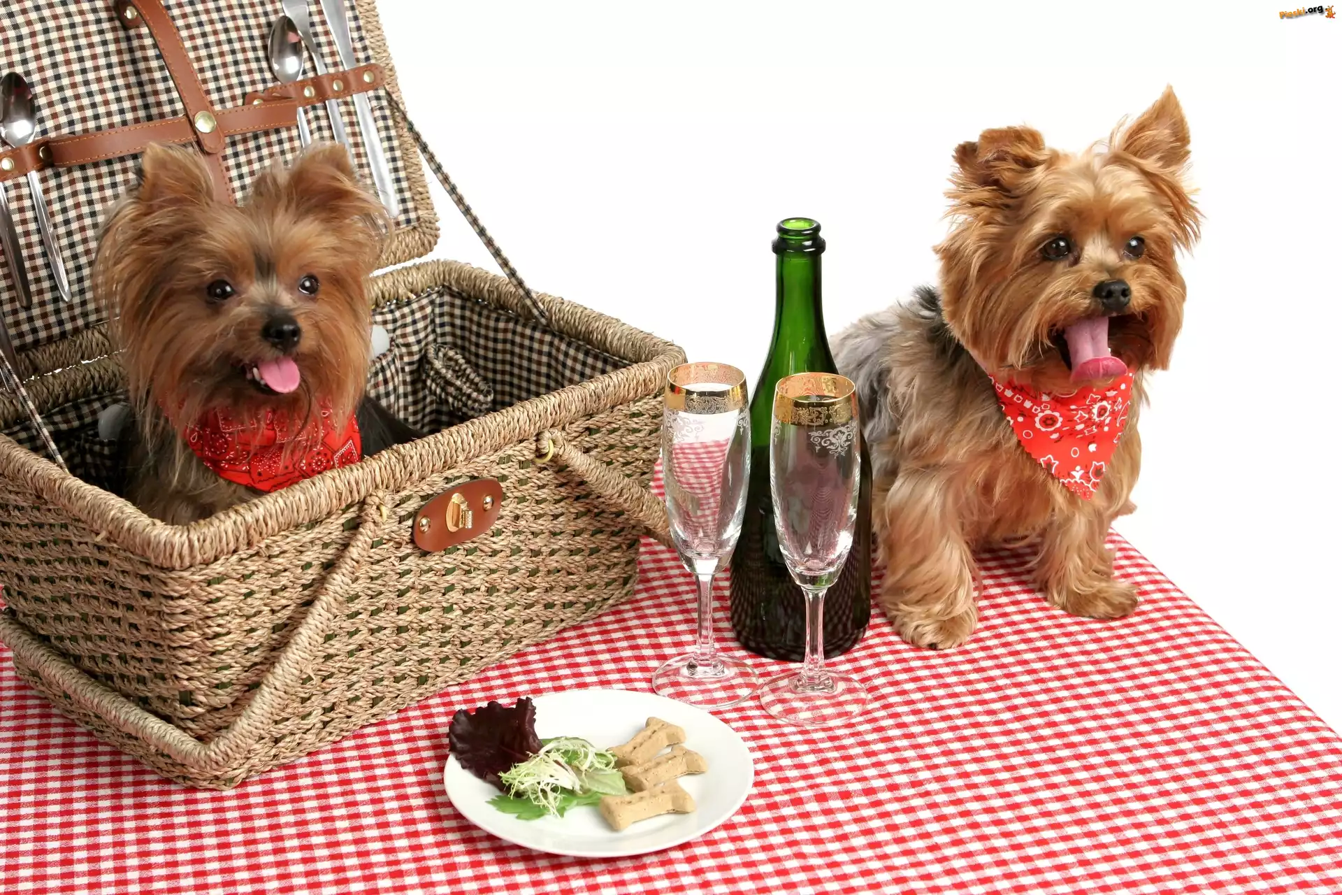 Kosz, Pieski, Dwa, Yorkshire Terrier, Piknik, Pieski