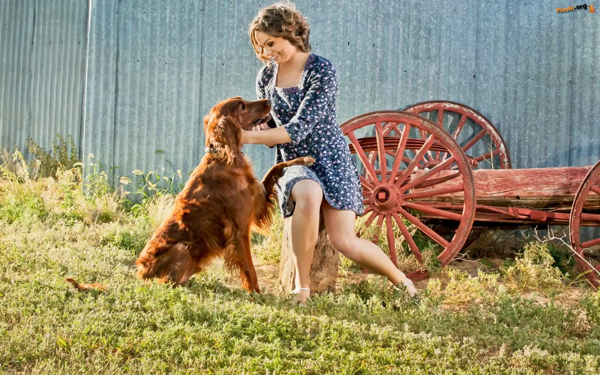 Lato, Pies, Kobieta, Wieś, Seter irlandzki