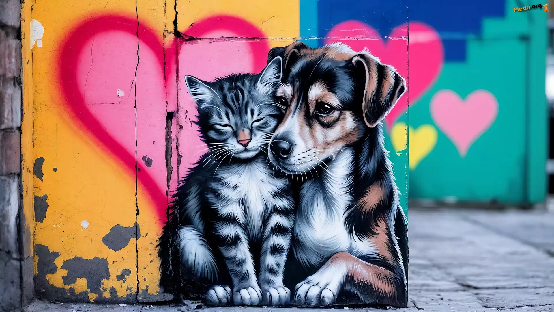 AI, Kot, Pies, Grafika, Street Art, Serce, Mural, Pieski