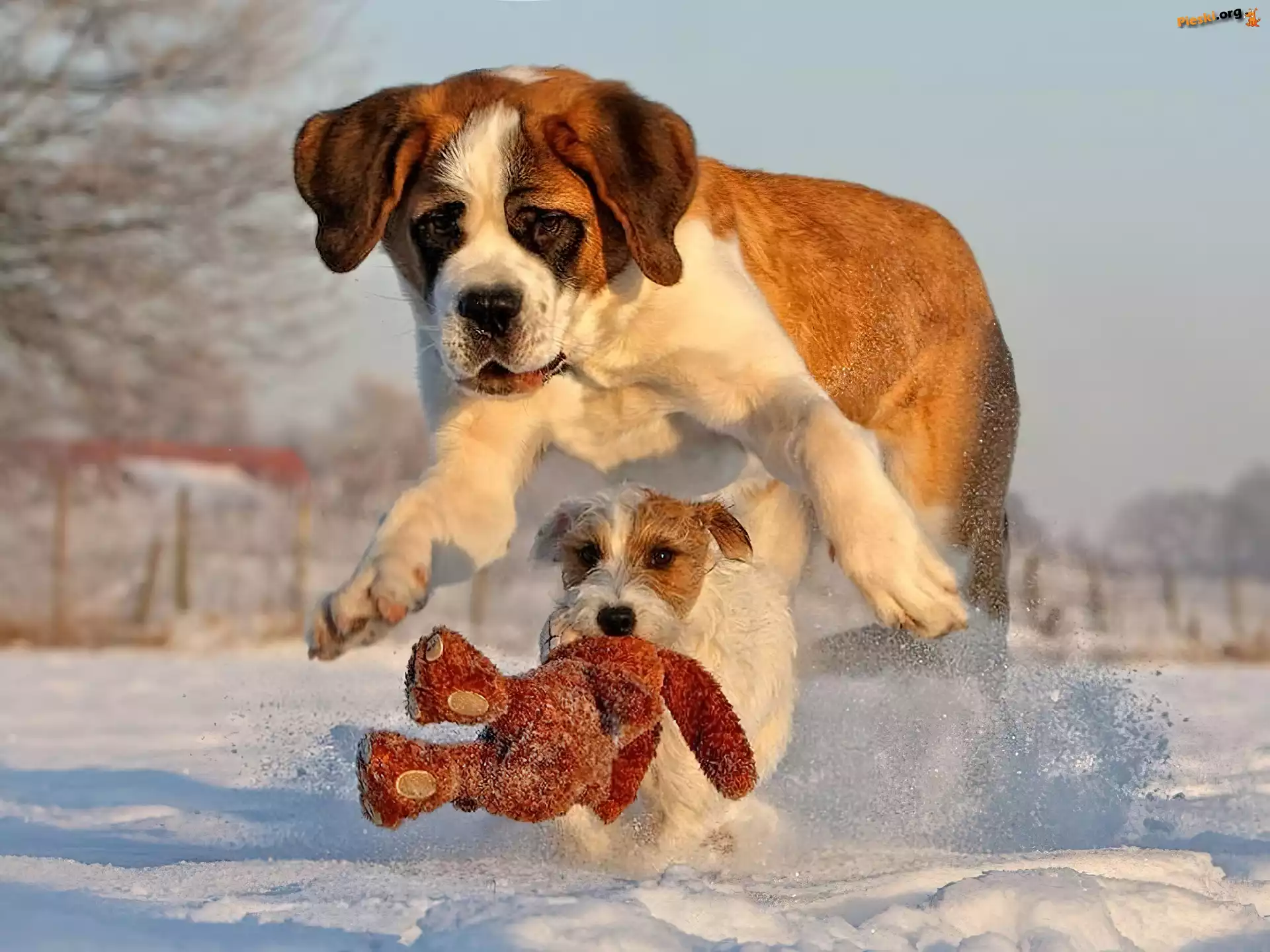 Śnieg, Psy, Bernardyn, Zabawka, Pieski