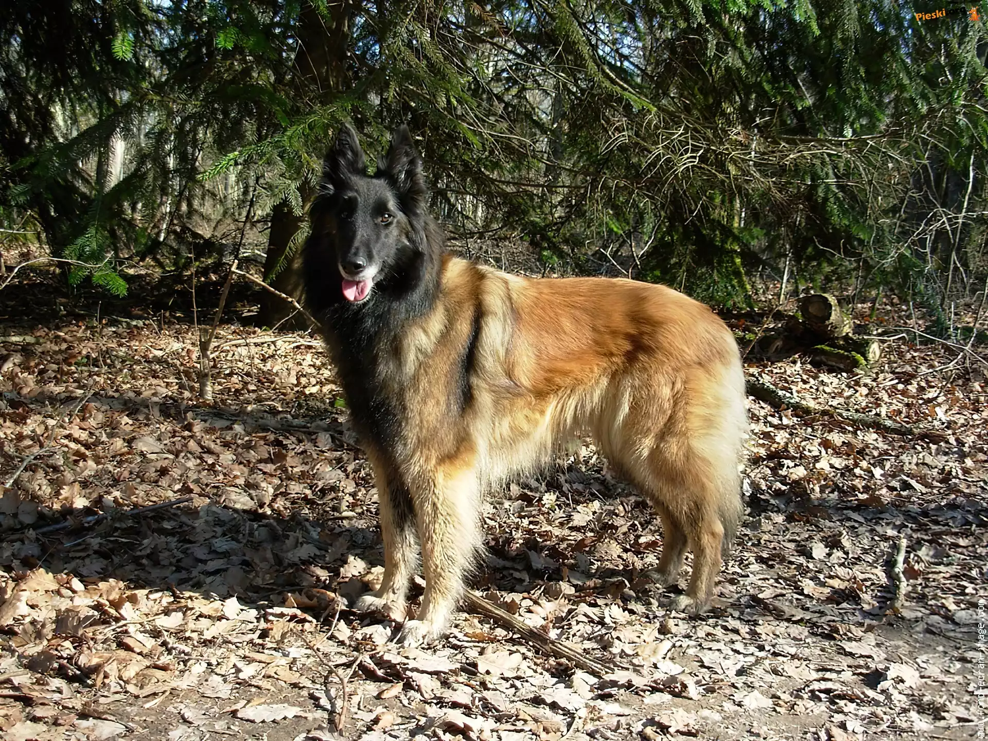 Owczarek belgijski Tervueren, suche, liście, Pieski