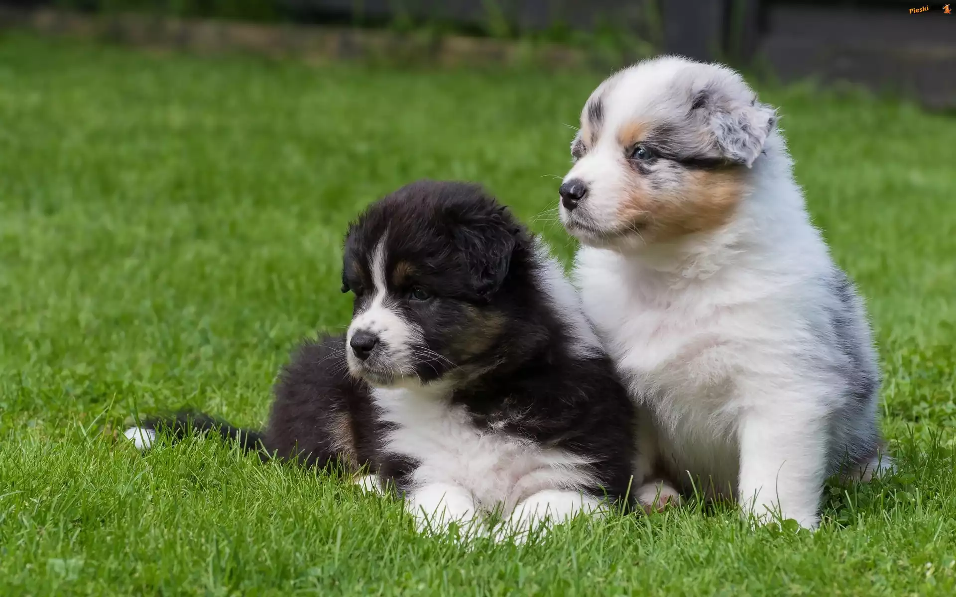 Owczarki australijskie, Szczeniaki, Trawa, Pieski