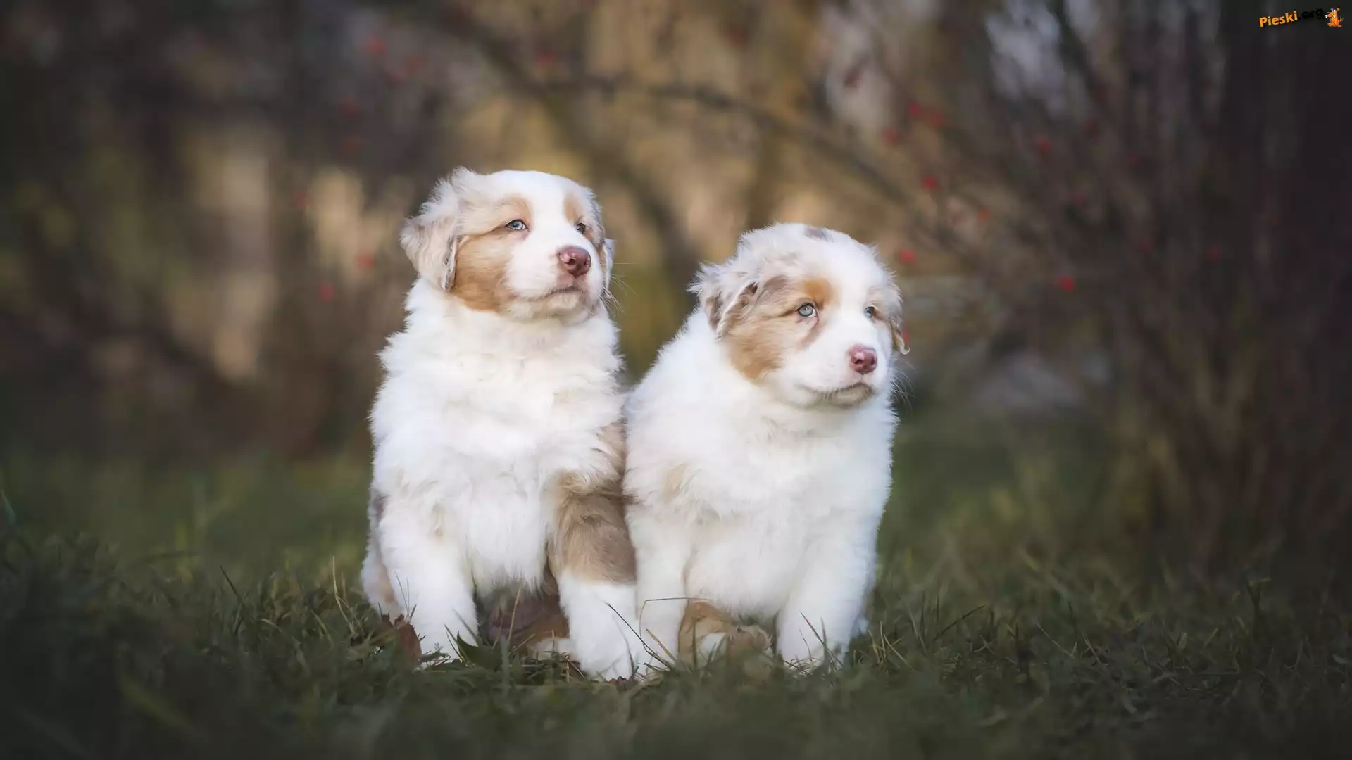 Owczarki australijskie, Psy, Dwa, Szczeniaki, Trawa, Pieski