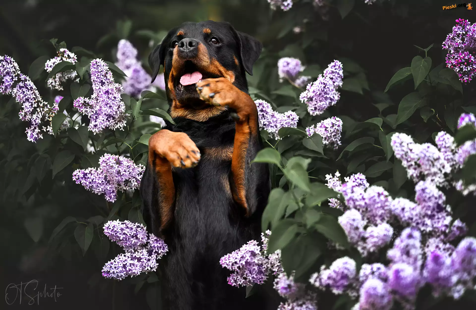 Bez, Kwiaty, Rottweiler, Pies, Pieski