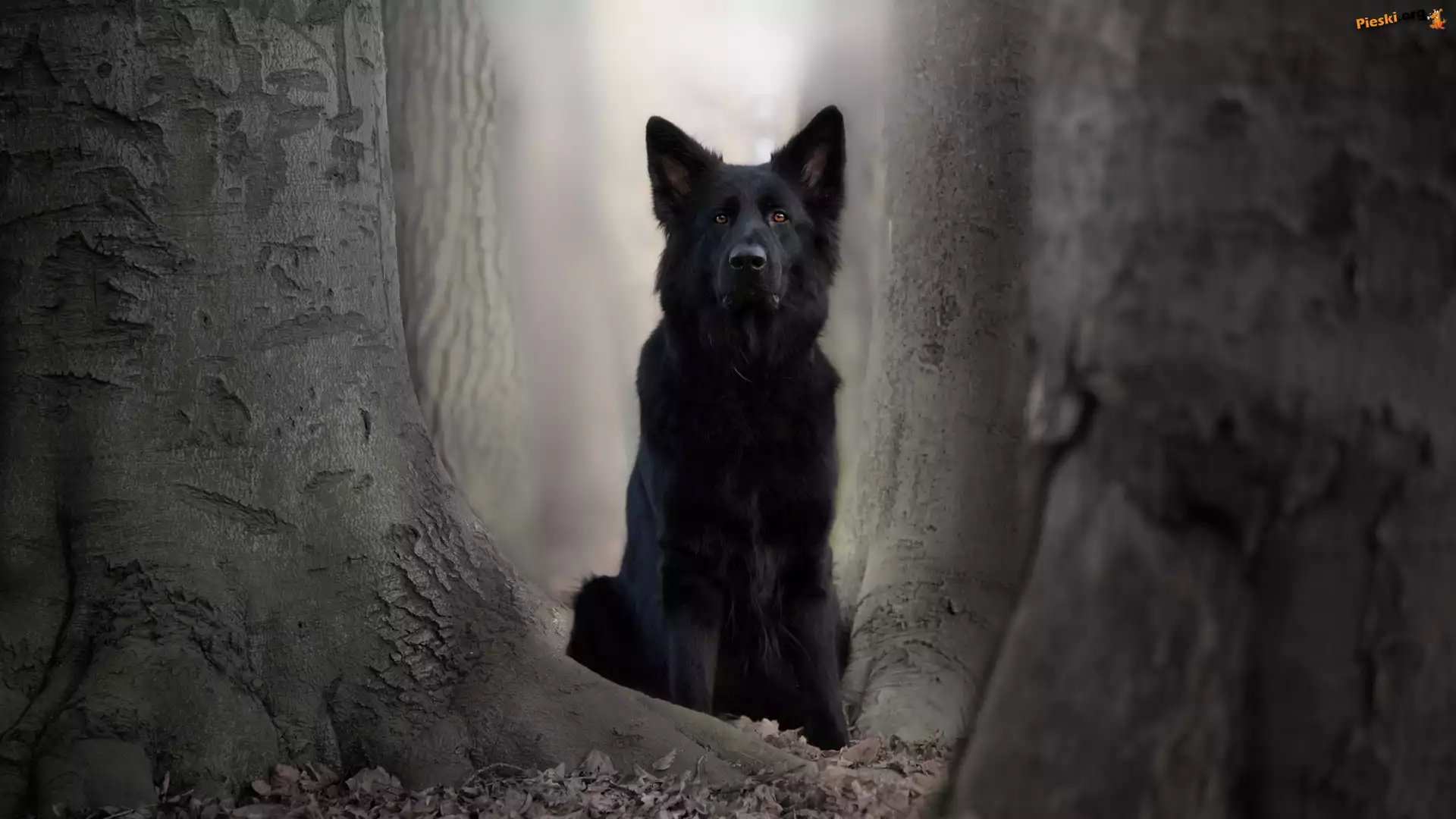 Pies, Czarny owczarek niemiecki, Drzewa, Pieski