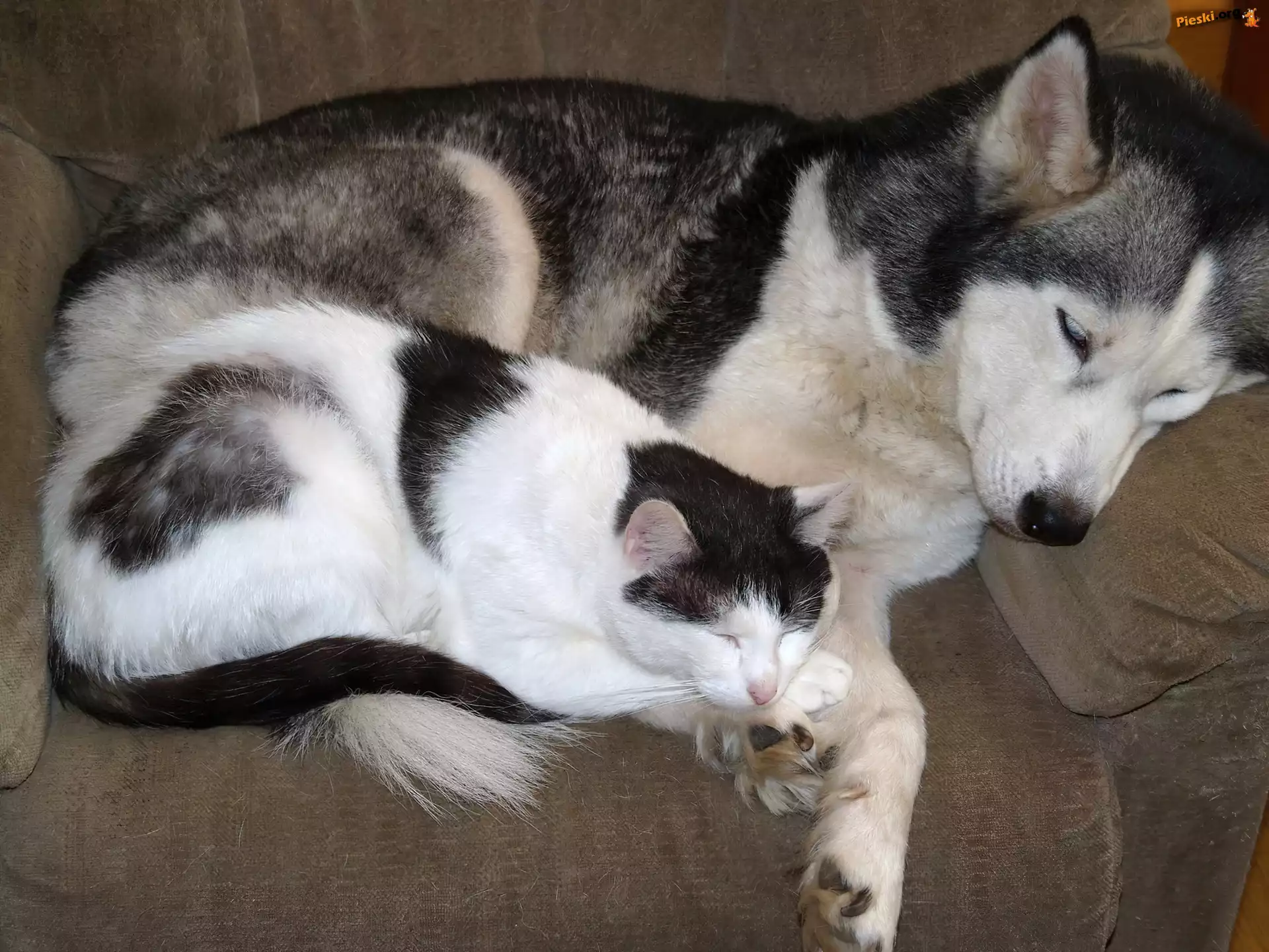 Pies, Śpiący, Kot, Siberian Husky, Pieski