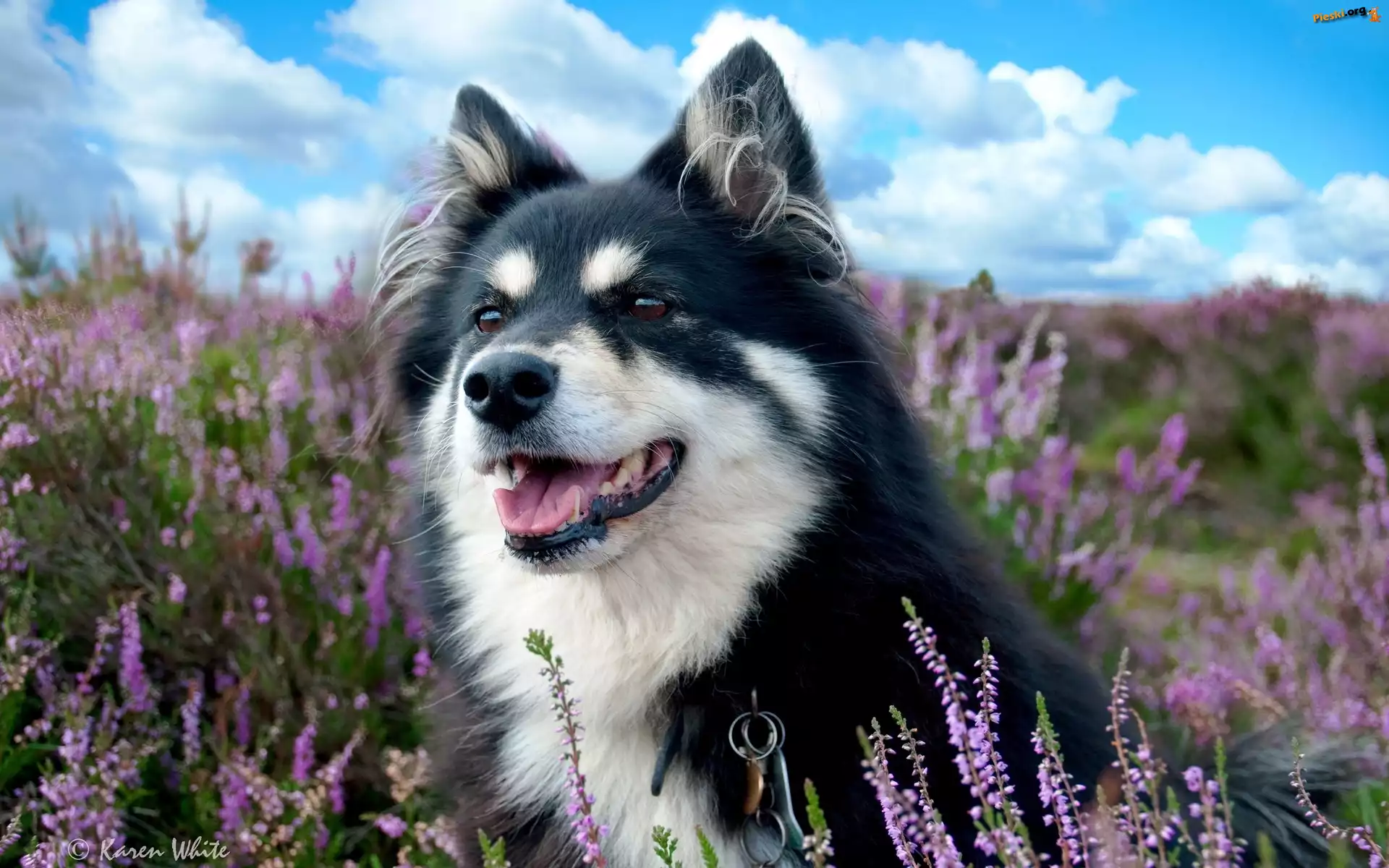 Rozmyte, ka, Border collie, Kwiaty, To Leonberger, Chopiec, Pies, Plaa ka, Pies, Border collie, Trawy