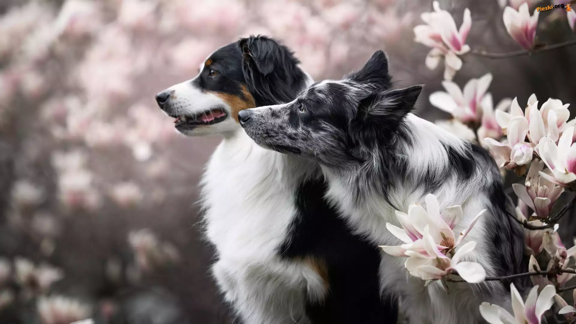 Owczarek australijski, Magnolie, Psy, Kwiaty, Border collie, Pieski
