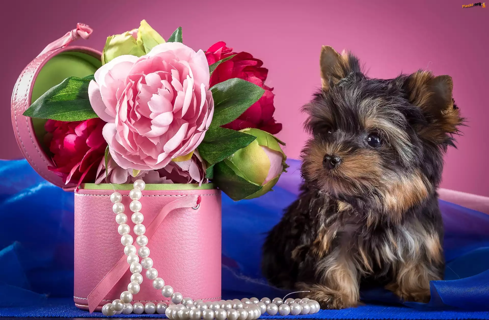 Pudełko, Yorkshire Terrier, Piwonie, Perły