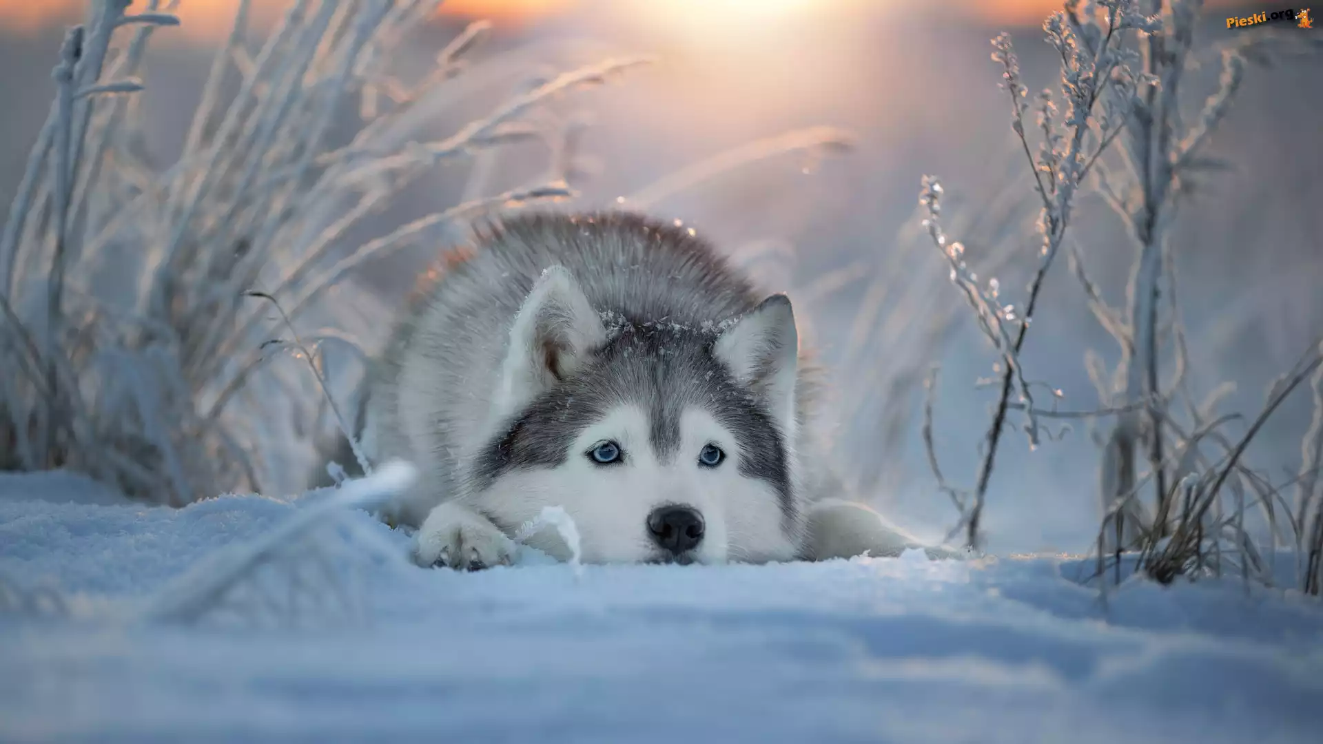 Siberian husky, Śnieg, Zima, Pies, Mordka, Pieski