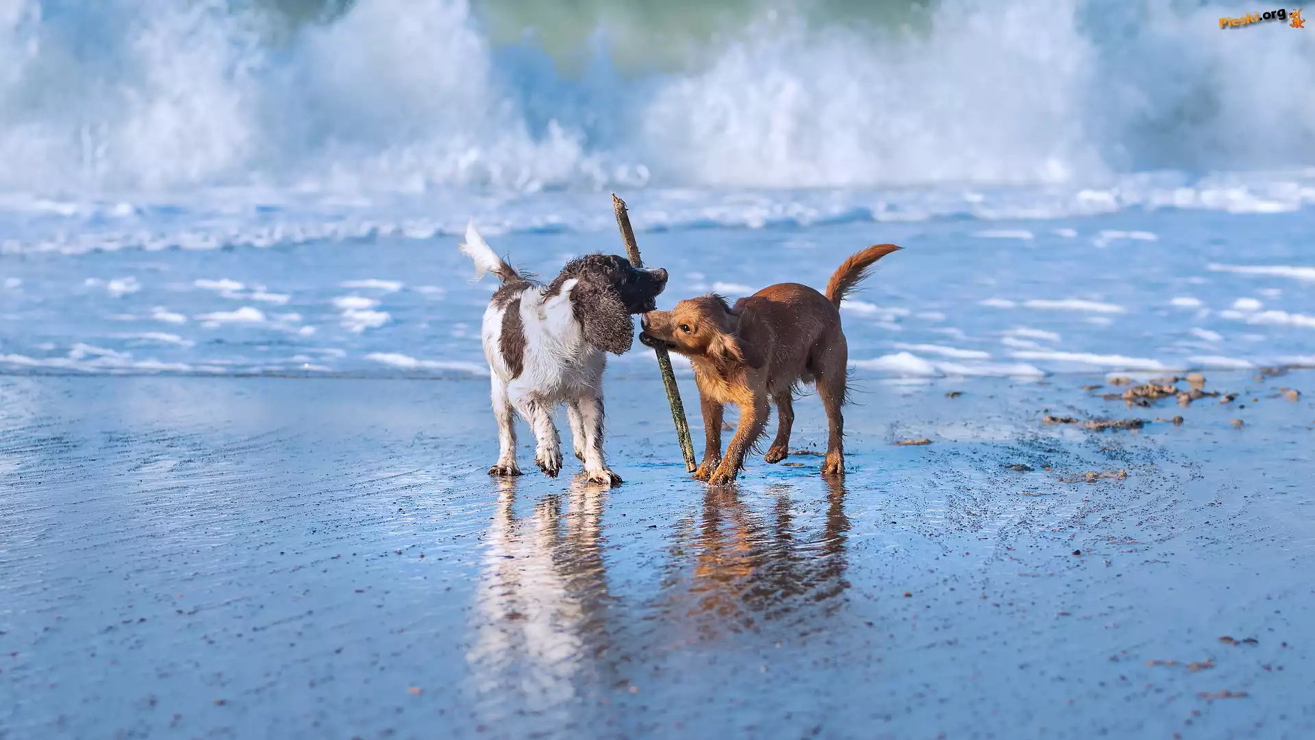 Zabawa, Dwa, Kij, Fala, Springer spaniel angielski, Psy, Working cocker spaniel, Morze, Pieski