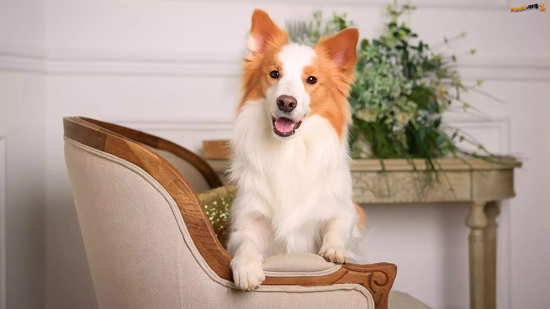 Pies, Stolik, Fotel, Border collie, Mordka, Kwiaty, Pieski