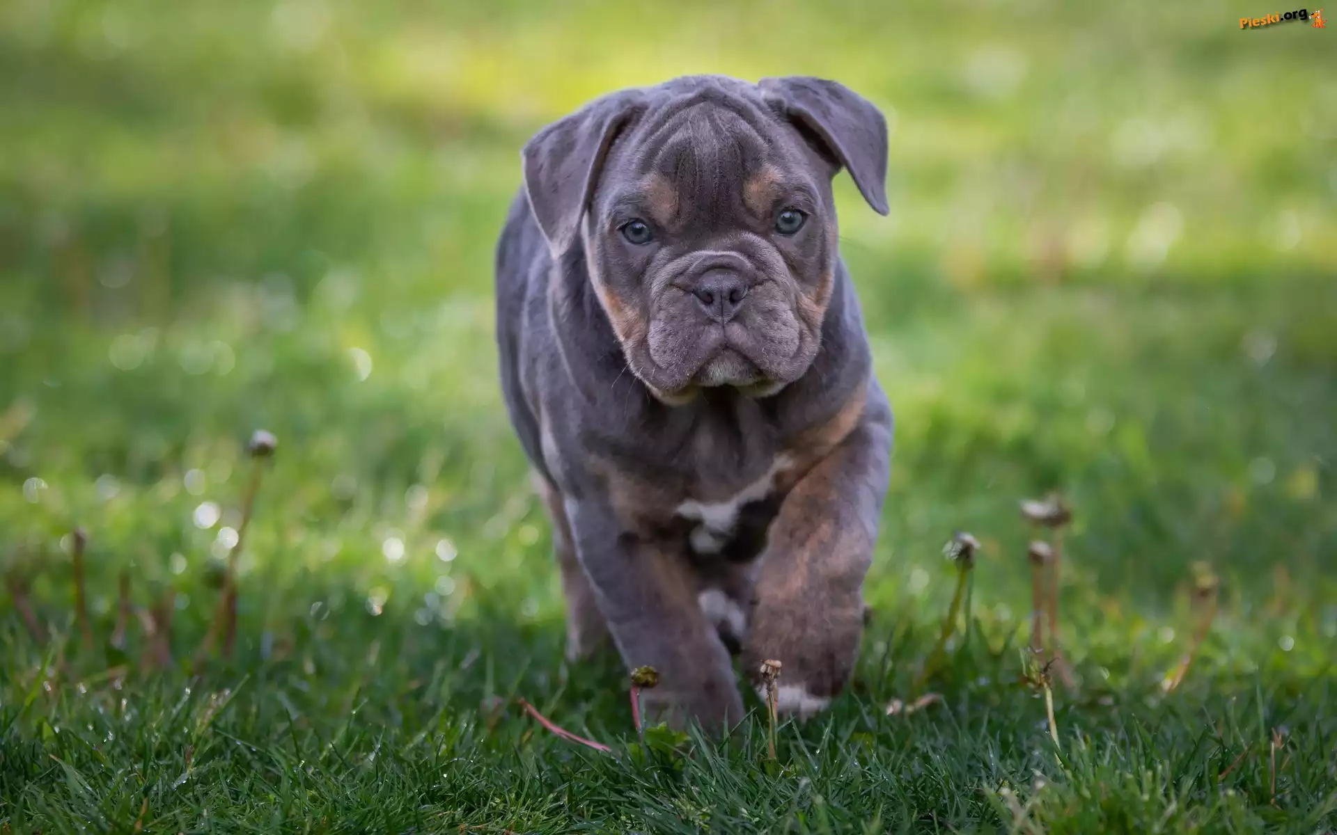 Szczeniak, Buldog angielski, Trawa, Pieski