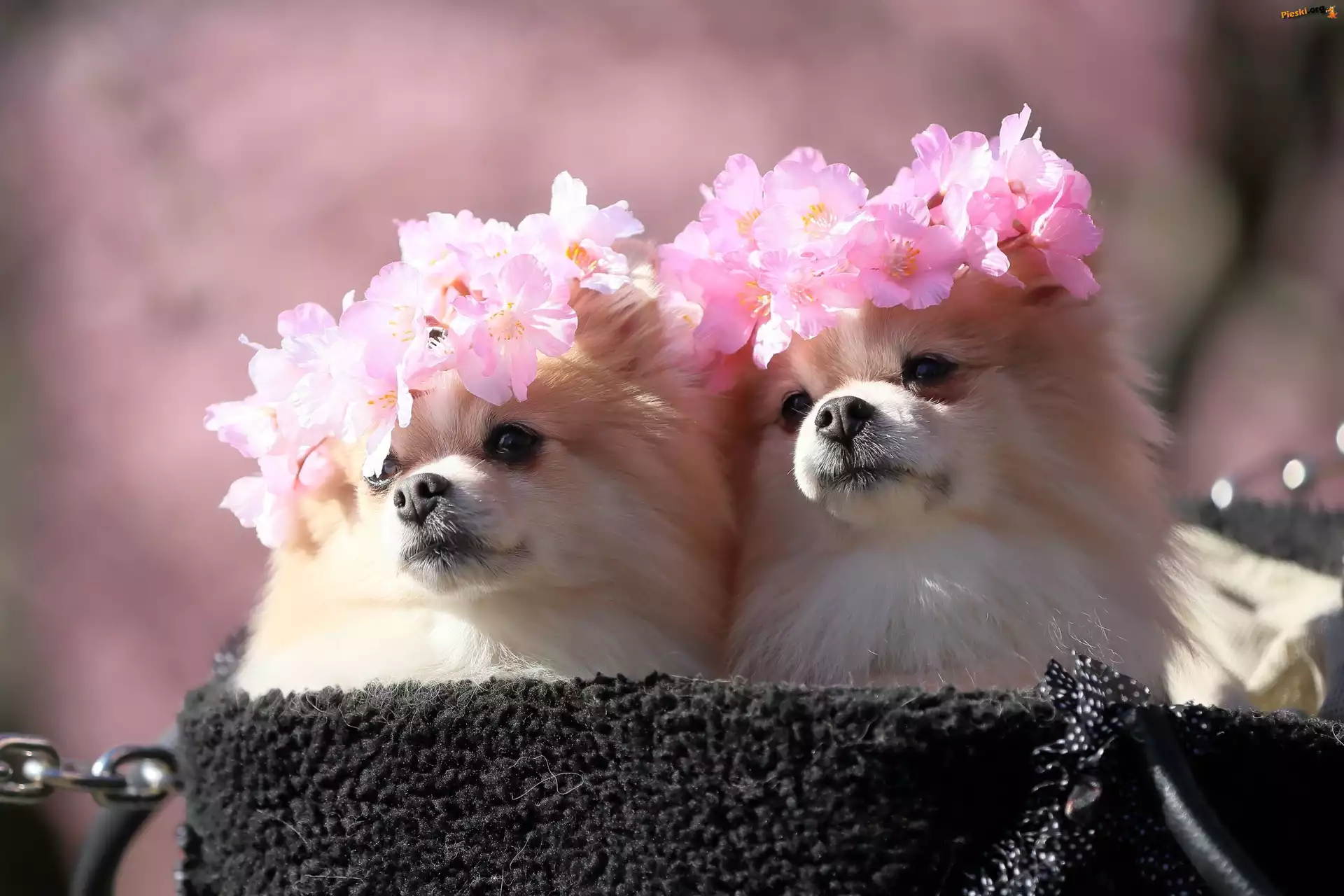 Szpice miniaturowe, Dwa, Psy, Wianki, Pieski