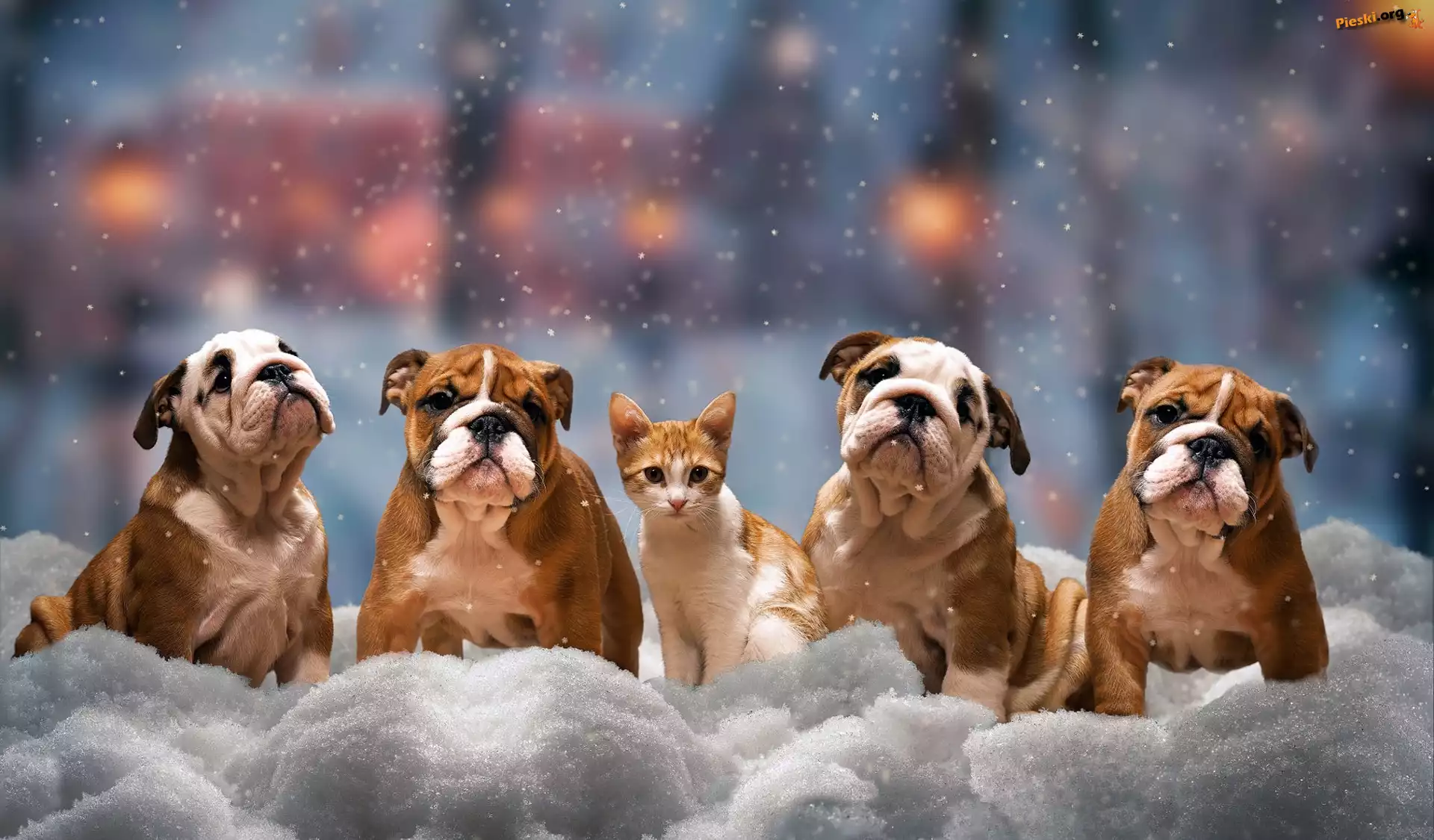 Cztery, Zima, Kot, Psy, Buldogi angielskie, Śnieg, Pieski