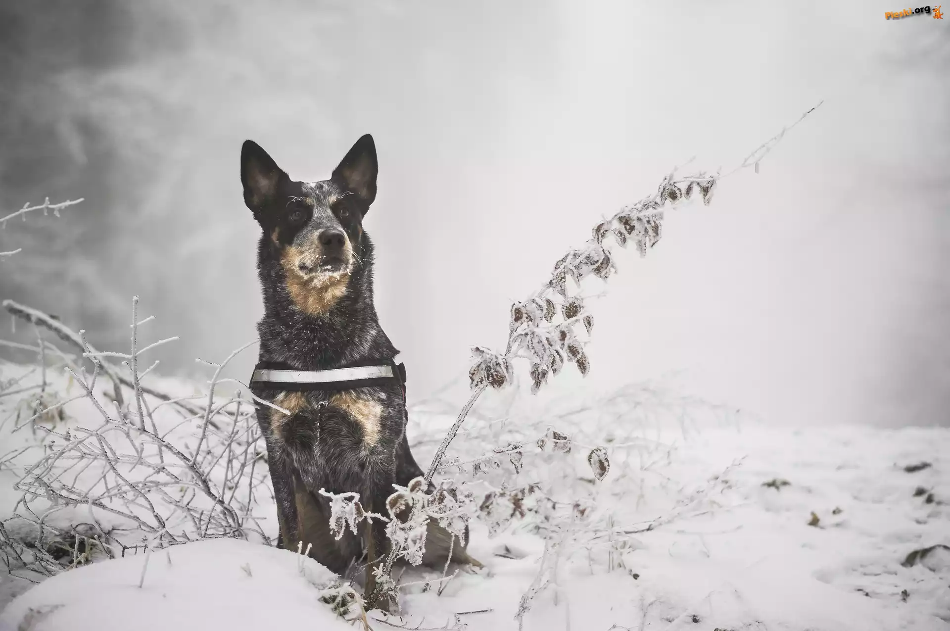 Gałązki, Zima, Australian cattle dog, Śnieg, Rośliny, Pieski