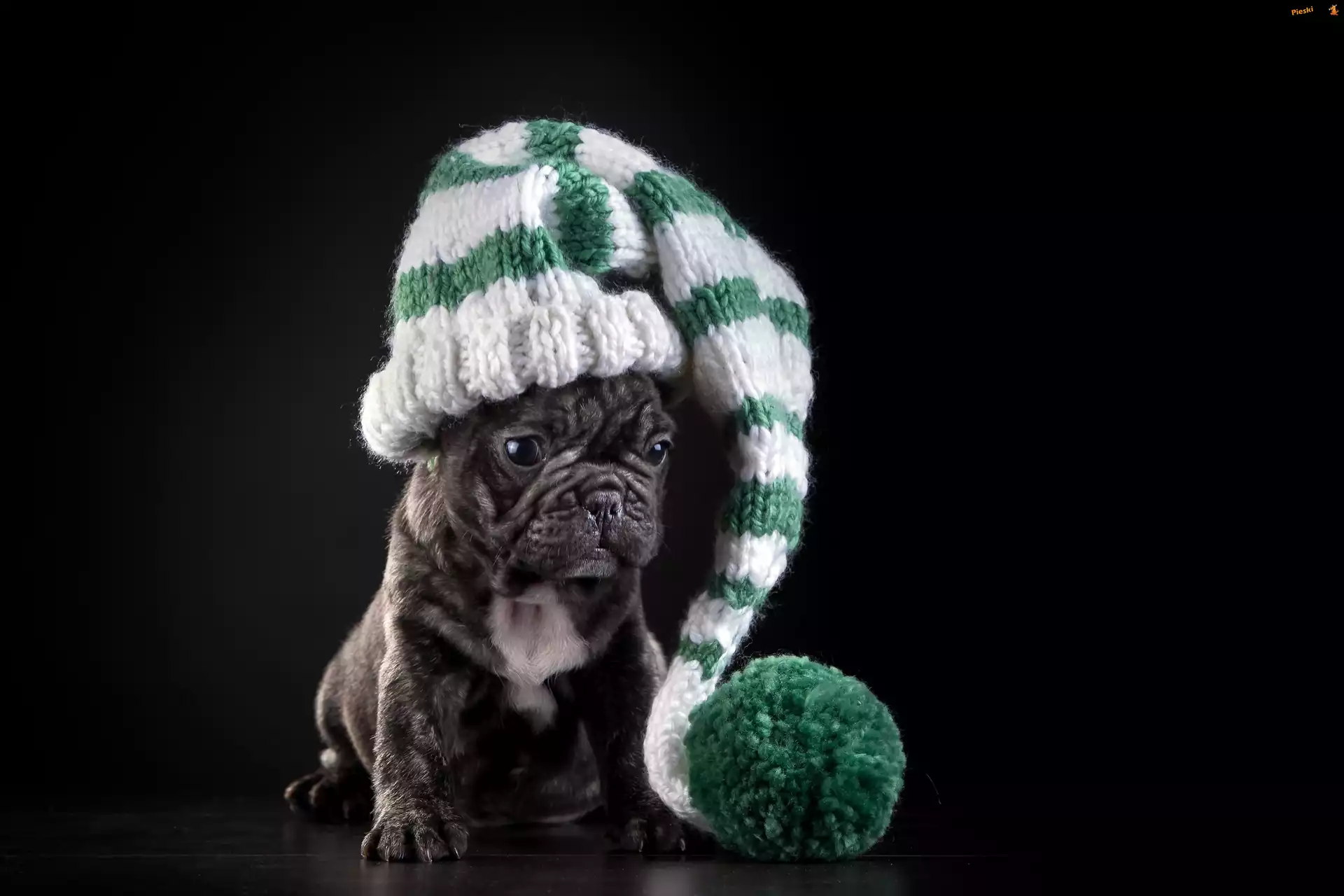 Czapka, Pies, Pompon, Szczeniak, Buldog francuski, Zimowa, Dzianina, Pieski