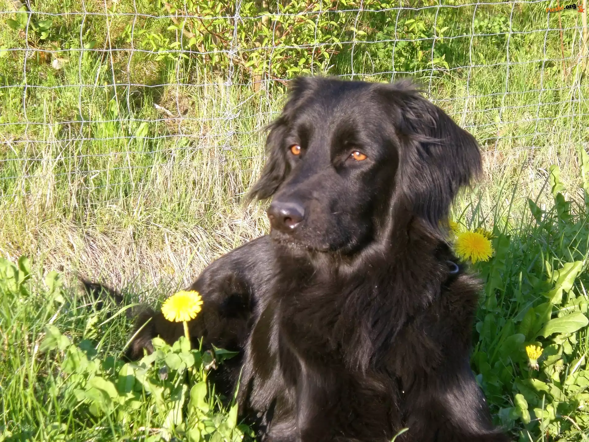żółte, czarny, Hovawart, kwiatki